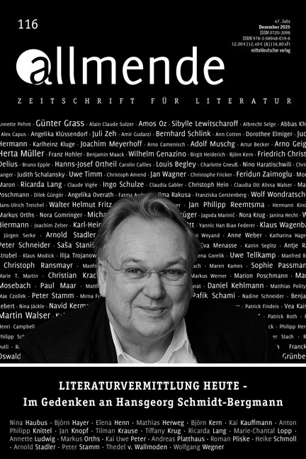 Hansgeorg Schmidt-Bergmann (1956–2025) war langjähriger Herausgeber der „allmende – Zeitschrift für Literatur“. Er wirkte als Literaturvermittler auf vielfältige Weise: als geschäftsführender Vorsitzender der Literarischen Gesellschaft e. V., als Leiter des Museums für Literatur und Gastgeber unzähliger Lesungen im Literaturhaus Karlsruhe sowie als Literaturwissenschaftler und Hochschullehrer am Karlsruher Institut für Technologie (KIT). Ausgehend davon ist zu fragen: Über welche Kanäle erreicht Literatur die Menschen?